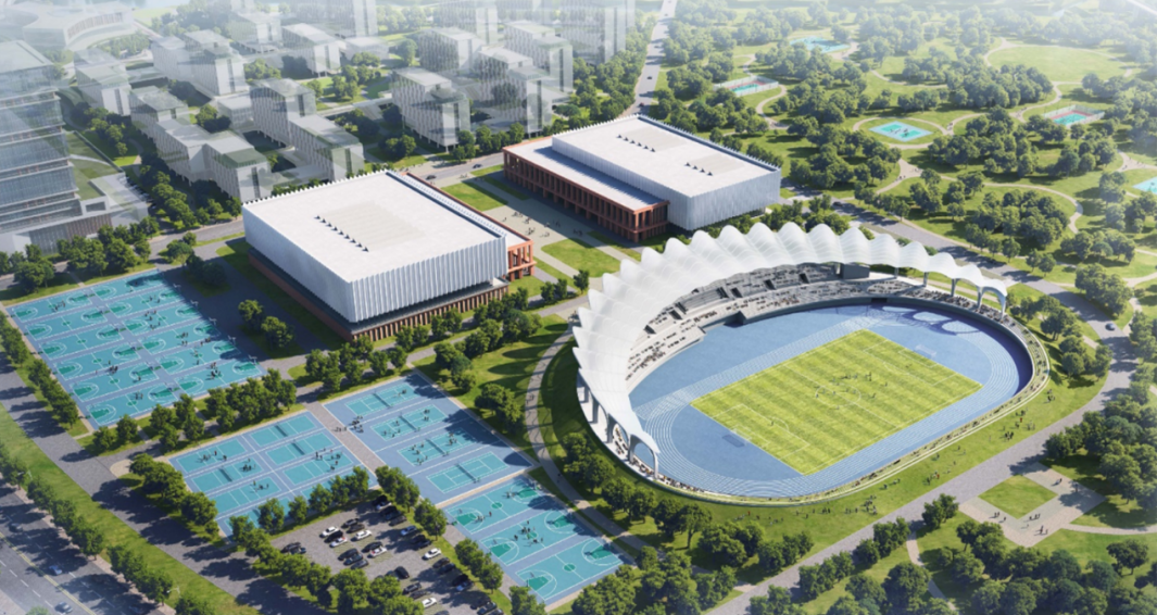 中心区左翼(西侧)规划有主体育馆、学术交流区、社团活动区和宿舍。