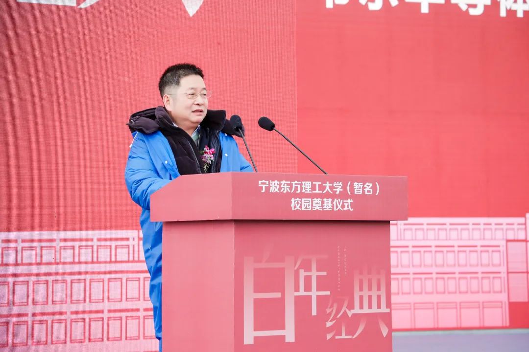 虞仁荣提到,前辈张伯苓先生曾说,“自强之道,端在教育”,我深以为然。在我的求学之路上,有幸碰到几位好老师,他们不光倾其所学授我以知识、生活上关心我一如慈母,更以他们踏踏实实、勤勉努力、不卑不亢的自身人格魅力表率了我的人生观。好的教育是一个少年前行的风帆。在我毕业以后的经商生涯里,在家乡办一所好学校是我心底时时翻滚的梦想。我的小学是在庄市读的,整个中学时代是在镇海中学度过的,两所学校离这儿都很近。作为土生土长的宁波人,我一直渴望能为我的家乡做些事,以我的绵薄之力回报生我养我的这片热土。中国科学院院士、宁波市东方理工高等研究院院长陈十一代表学校致辞,“大学事业、千秋万代。我们要以“大师”构筑大学之魂,以“大楼”搭建大学之基。一流的大学校园,就犹如土壤、水分和空气,释放着大学文化的层次和品味,滋养着师生精神的塑造和发展。九层之台,起于累土。奠基仪式的举行,标志着东方理工大学建设进入了一个新的历史阶段。2022年12月29日,这个特殊的日子必将载入东方理工大学的史册、载入宁波市的史册、载入中国高等教育的史册。看着这片热火朝天的工地,畅想不远的将来,甬江北岸将崛起一座建筑精美典雅、景色秀丽怡人、文化兴盛繁荣的百年校园,成为宁波市一张经典的名片,与宁波人民的母亲河——甬江,一同渊远流长,让人热血沸腾、满怀希望。我们相信,随着大学与城市的共生,东方理工必将成为宁波现代化滨海大都市建设的点睛之笔,成为推动宁波打造全球智造创新之都的强大引擎。”