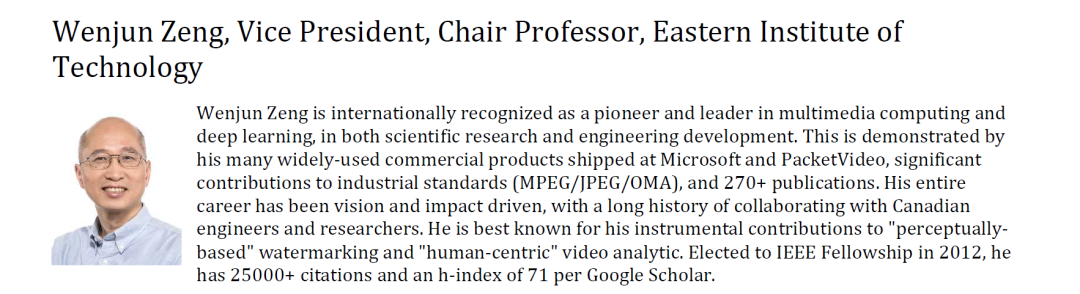 曾文军教授1990年毕业于清华大学电子工程系,1993年和1997年分别获美国圣母大学和普林斯顿大学电气工程专业的硕士和博士学位。曾文军教授在学术界和产业界均具有丰富的国际化研究和管理经验,先后就职于美国松下信息技术实验室、贝尔实验室,夏普实验室、PacketVideo等公司,曾任密苏里大学计算机科学系终身正教授。2014年任职于微软亚洲研究院,担任高级领导团队(SLT)成员、首席研究员,期间带领团队为微软云平台Azure、Office、Dynamics、Windows Machine Learning等产品和平台开展视频技术分析、媒体分析等工作。曾文军教授长期以愿景和影响力为驱动,引领国际合作,尤其是与加拿大工程师和研究员开展的深入合作,极大促进了其工程领域的研究开展。同时,对国际标准—ISO MPEG(国际视频编码标准)、JPEG 2000(国际图像编码标准)和Open Mobile Alliance (国际开放移动联盟)的发展做出重大贡献。