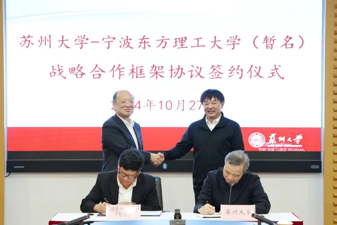 10月27日,宁波东方理工大学与苏州大学战略合作框架协议签订仪式在苏州大学天赐庄校区举行,双方将在科研合作、师资队伍建设、学生交流、博士生联合培养等方面推动合作,服务国家战略,助力创新驱动发展。中国科学院院士、我校校长陈十一,中国工程院院士、苏州大学校长应汉杰出席仪式并讲话,我校副校长郑春苗与苏州大学副校长沈明荣代表双方签约。苏州大学副校长姚建林出席此次签约仪式。