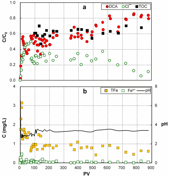 图3长期注入DCA溶液实验结果:(a) DCA的穿透曲线,以及在动态流动条件下Cl−和总有机碳(TOC)的穿透曲线。(b)出水中总铁(TFe)、亚铁离子(Fe²⁺)的浓度及pH值变化。[DCA]₀=0.5 mM;[PS]₀=10 mM。