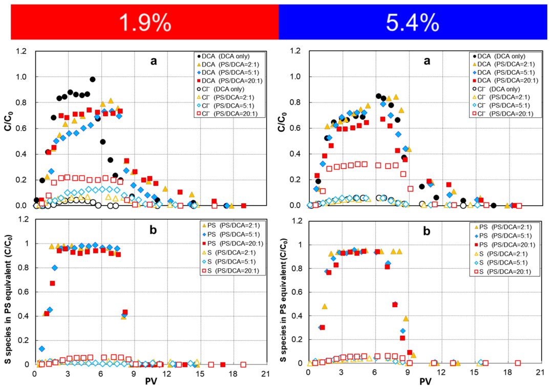 图1 在MNPs质量含量为1.9%和5.4%的砂柱中动态流动条件下DCA的降解。(a)DCA的穿透曲线及Cl-的淋洗曲线;(b)PS和硫酸盐的穿透曲线。