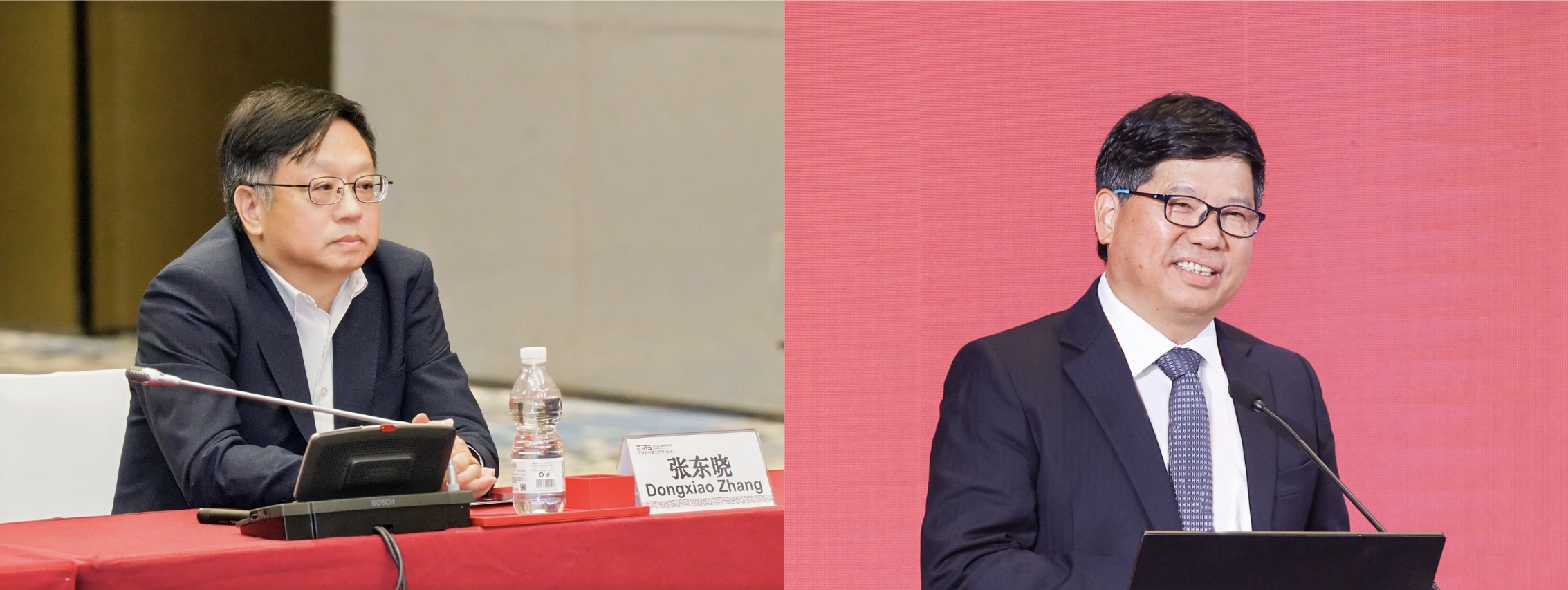 常务副校长兼教务长张东晓(左)与副校长兼工学部筹建负责人郑春苗(右)发言
