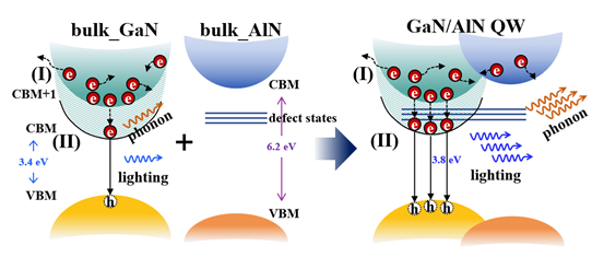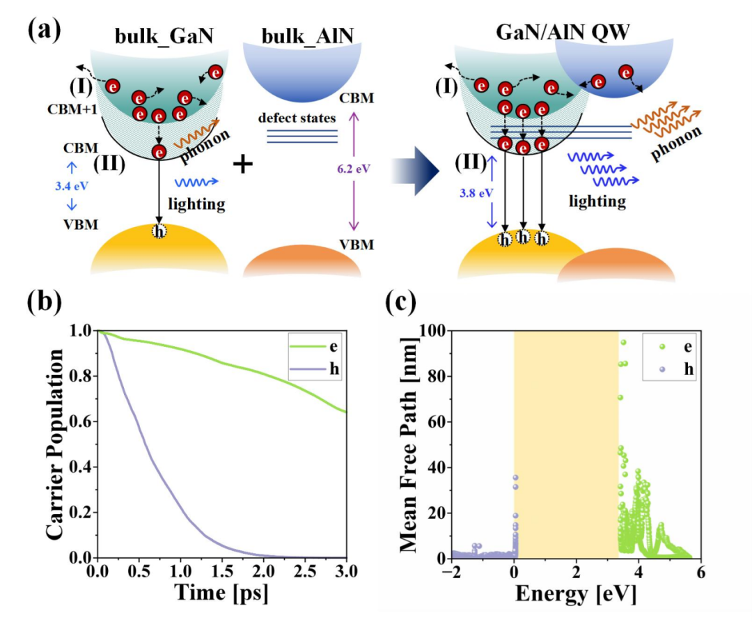 魏苏淮教授和石芝铭、孙晓娟、黎大兵研究员团队基于对氮化物能带结构和载流子动力学的分析,首次提出通过调控GaN/AlN量子阱界面的氮空位缺陷,实现对电子冷却速率的有效增强。这些缺陷状态作为中间能级,能够显著加强电子-声子相互作用,从而加速电子向导带底冷却。第一性原理计算表明,该策略可使电子冷却时间缩短超过一个数量级,有效实现与空穴冷却速率的动态平衡,大幅提升发光效率。与传统EBL结构相比,该方法无需额外结构设计,即可实现电子动力学的精准调控。该研究还进一步拓展了半导体缺陷物理的研究边界,系统验证了缺陷在调控器件性能方面的“有益性”作用,颠覆了缺陷是有害的传统认知,为新一代电子与光电子器件的缺陷工程设计提供了理论支撑和新思路。