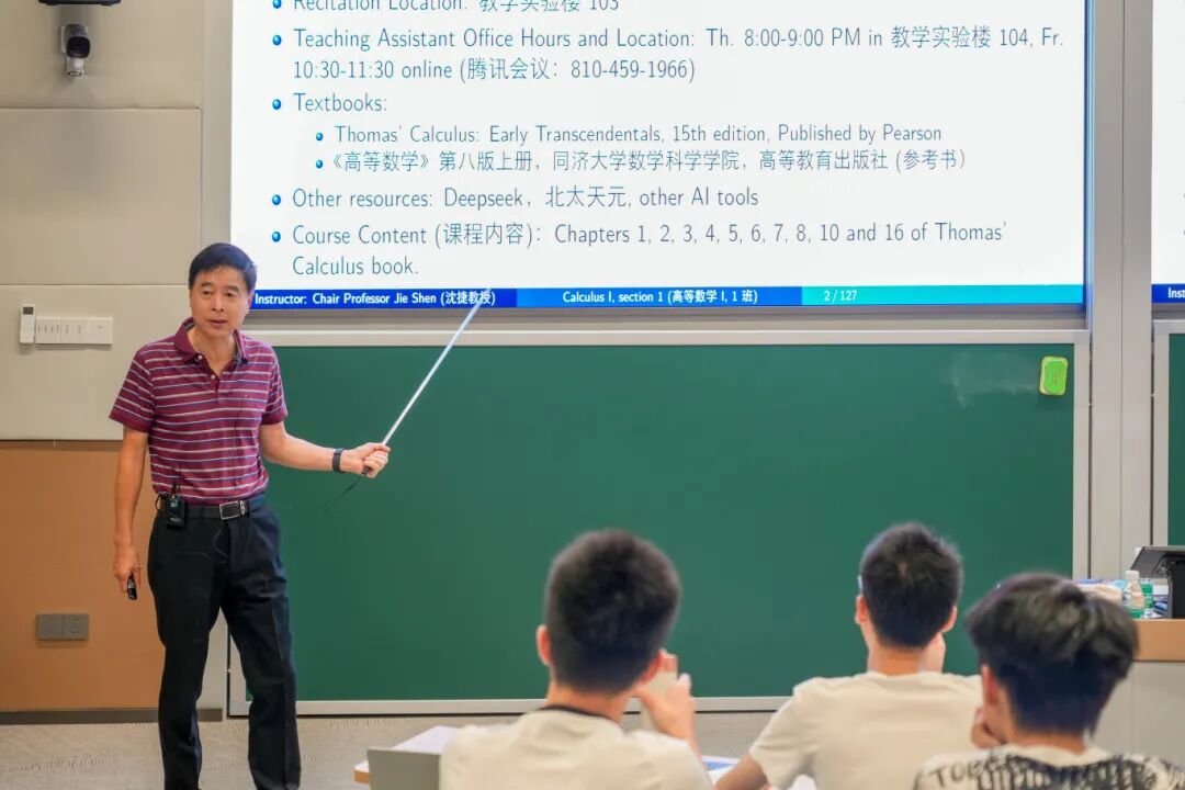 今天的第一堂课是《高等数学I》。在正式上课前,校长陈十一、党委书记金波、常务副校长兼教务长张东晓等校领导一行走进教室。在教学实验楼的两个平行课堂里,两位讲席教授——沈捷与王晓明,即将引领着学生们进入微积分的深邃世界。陈十一校长与沈捷、王晓明两位教授亲切交流,了解课程准备情况,并与学生互动,勉励他们打好坚实基础。