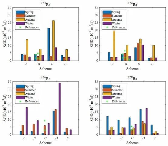 郑春苗研究团队将该方法应用于大亚湾区域(图2),使用2015-2016年采样得到的地下水和海水的四种镭同位素(223Ra,224Ra,226Ra,228Ra)数据,分别估算春、夏、秋、冬四个季节的SGD。结果表明四个季节中,SGD从大到小依次为秋季、春季、夏季和冬季(图3)。该方法的估算总量与传统方法相当,多个同位素的估算结果可相互印证。地下水同位素的空间异质性给SGD的估算带来很大的不确定性,研究表明更多的地下水采样可为SGD的估算提供更详细的空间分布。海洋的水动力过程会影响海水同位素的活度变化,进而增大SGD估算的不确定性。研究结果显示,海水的同位素采样需要同时考虑水位波动和同位素活度对水位变化的延迟效应,避免极端同位素活度的影响。水动力和同位素运输模型可为海水同位素采样提供有效指导,以得到更有代表性的海水同位素活度数据。