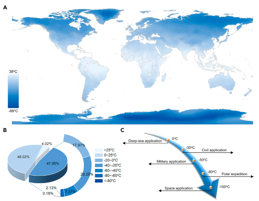 图1.全球平均冬季最低温度及不同应用场景下的温度极限要求