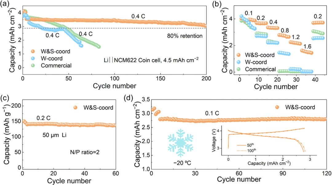 该概念以溶剂化化学为基础,通过弱配位和强配位阴离子同时溶解锂和束缚铝:弱配位阴离子(FSI-)具有高离子传输动力学,而强配位阴离子(氮化物,NO3-)可稳定铝表面。这种电解质即使在4.5 mAh cm-2的高负载下也能实现良好的低温性能。配备这种电解质的电池可在-20℃和25℃温度下分别运行120和200个循环,容量保持率分别为80%和85%。这项工作有望启迪人们利用溶解化学介导锂传输和铝腐蚀,从而提升低温锂金属电池性能。