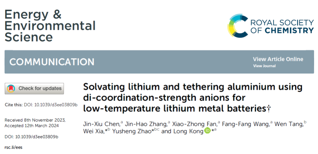 近日,宁波东方理工大学讲席教授赵予生、助理教授夏威和西北工业大学教授孔龙团队合作提出了一种全新的二配位强度阴离子概念,为解决上述难题提供了崭新视角。该成果以“Solvating lithium and tethering aluminium by di-coordination-strength anions for low-temperature lithium metal batteries”为题发表在能源和环境顶级期刊Energy &Environmental Science。