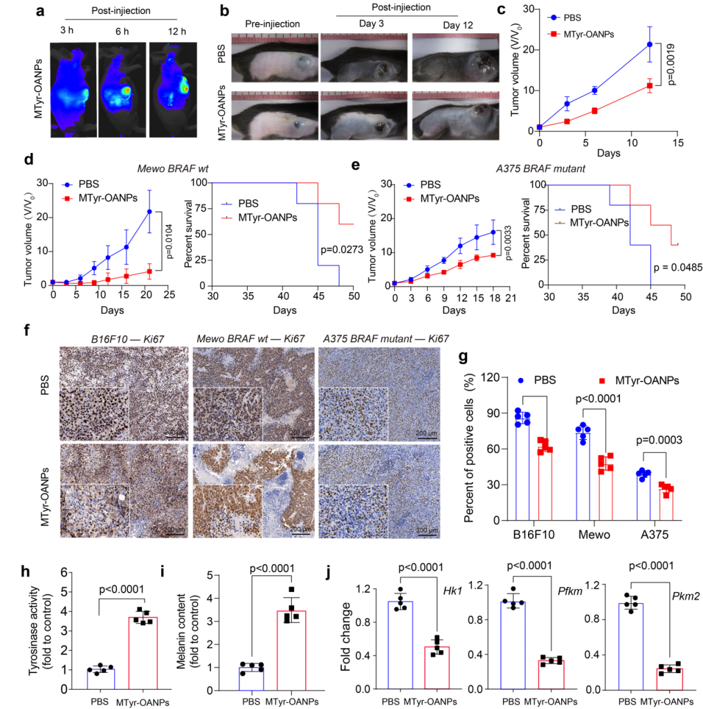 结果显示,酪氨酸纳米胶束在体内可靶向黑色素瘤(靶向效率4.4%),对小鼠和人来源的黑色素瘤(包括BRAF突变型/野生型)都发挥了一定的抗肿瘤作用,且对BRAF野生型肿瘤效果更好(图5)。研究指出,这可能与BRAF突变黑色素瘤中调控黑素合成的转录因子MITF过度泛素化有关,从而为该纳米药物的临床应用提供了科学依据。