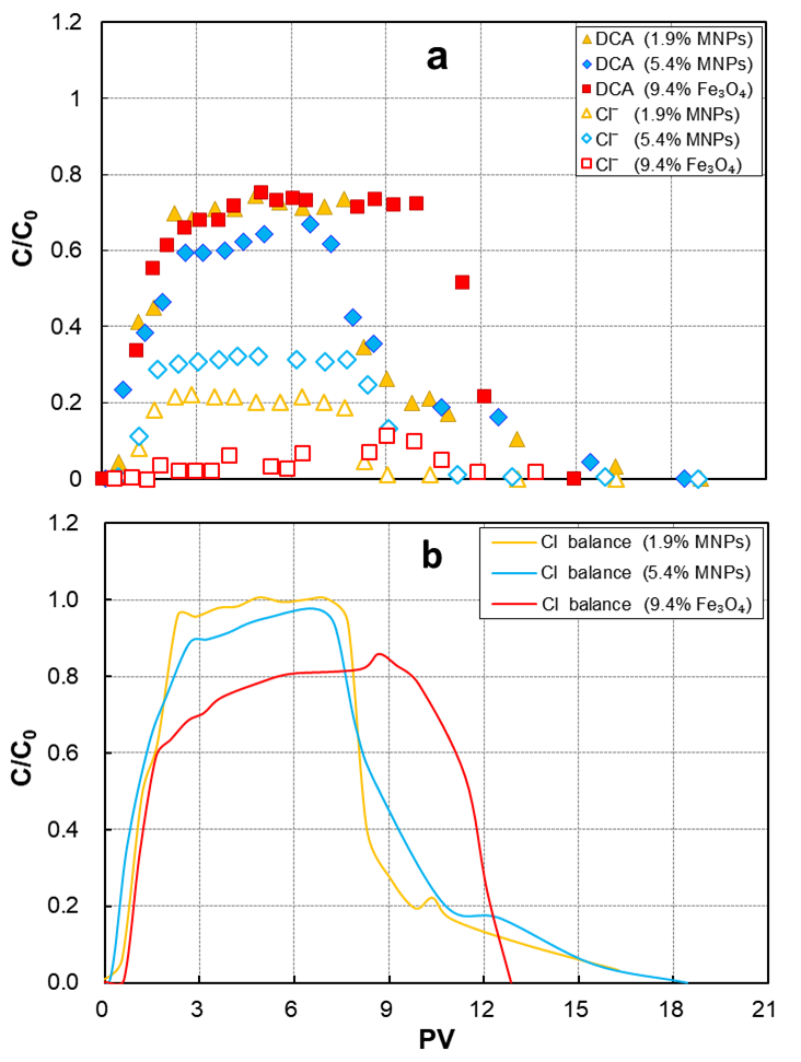 图1 在MNPs质量含量为1.9%和5.4%的砂柱中动态流动条件下DCA的降解。(a)DCA的穿透曲线及Cl-的淋洗曲线;(b)PS和硫酸盐的穿透曲线。
