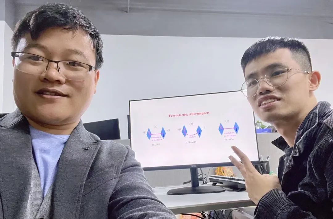 2024年,交错磁体的发现被评为《Science》年度十大科学突破进展。然而,对于如何在交错磁体中引入磁电耦合并实现对其磁性与自旋的电场调控,一直缺乏系统可行的方法和材料平台。作为加入课题组最早的“元老”之一,段训凯在周通指导下,从23年9月份便开始针对这个当下的科研热点与难点展开研究。通过综合运用对称性分析、紧束缚模型与第一性原理计算,他们首先将反铁电性与交错磁性相结合,首次提出了反铁电交错磁体(AFEAM)这一新概念与相应材料实现,相关成果于2025年3月以“Antiferroelectric Altermagnets: Antiferroelectricity Alters Magnets”为题发表于Physical Review Letters并获“编辑推荐”,同时,美国物理学会创办的科学报道期刊《Physics》、新闻报道网站Phys.org与《环球科学》等对该研究进行了专题报道。