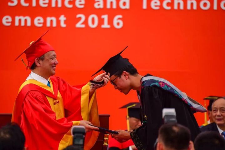 图为陈十一院士为学生拨穗