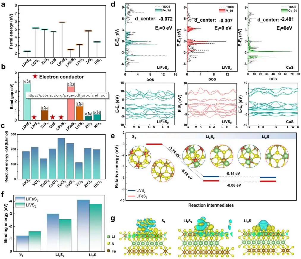 图2 - 基于以下筛选准则对锂金属硫化物及金属硫化物基材料的计算筛选结果。(a) 费米能级;(b) 带隙;(c) 反应能 (T = 0 K);(d) 态密度 (DOS);(e) Li2S2和Li2S还原态在 LiVS2 (蓝线) 和 LiFeS2 (红线) 相上的吸附能量曲线;(f) LiVS2、LiFeS2与硫基分子(S8、Li2S2、Li2S)结合能;(g) LiFeS2催化作用示意图。