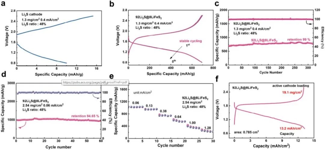 图4 - 电化学性能测试结果。(a) 基于 Li₂S/Li₆PS₅Cl/C = 6:3:1,在活性正极载量 1.3 mg/cm²、 电流密度 0.4 mA/cm² 下的充放电曲线;(b, c) 基于 92Li₂S@8LiFeS₂/Li₆PS₅Cl/C = 6:3:1,在活性正极载量 1.3 mg/cm²、 电流密度 0.4 mA/cm² 下的充放电曲线与循环性能;(d) 92Li₂S@8LiFeS₂ 正极在 2.54 mg/cm² 活性载量下的循环性能;(e) 在 2.54 mg/cm² 活性载量下的倍率性能;(f) 在高 Li₂S 正极载量下的电化学充放电曲线。