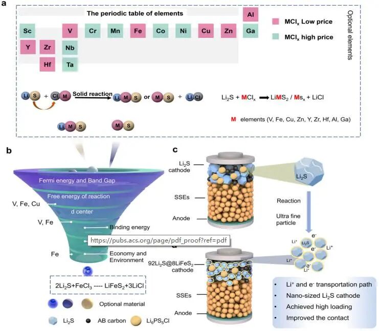 图1 - 高性能全固态锂硫电池 (ASSLSBs) 正极设计原理示意图。(a) Li2S与多种金属氯化物发生通用固态反应的示意图。(b) 用于筛选最合适导体的过程细节。(c) Li2S 正极和 (d) 92Li2S@8LiFeS2复合正极的电池结构与性能对比。