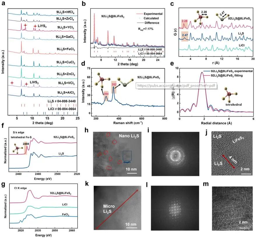图3 - 结构与形貌分析。(a) 9Li₂S + MClₓ(M = Al, Ga, Zn, Cu, Fe, V, Zr, Hf, 和 Y)的同步辐射 XRD 结果;(b) 92Li₂S@8LiFeS₂ 正极的 Rietveld 精修结果;(c) 92Li₂S@8LiFeS₂、Li₂S 和 LiCl 的 PDF 分析;(d) 92Li₂S@8LiFeS₂ 的拉曼光谱;(e) Fe K 边 EXAFS 的 R 空间(k³ 加权);(f) 92Li₂S@8LiFeS₂ 和 Li₂S 的 S K 边 XANES 光谱;(g) 92Li₂S@8LiFeS₂ 与标准 LiCl、FeCl₃ 样品的 Cl K 边光谱。(h, k) 92Li₂S@8LiFeS₂ 和 Li₂S 的低倍 TEM 图像及对应的 FFT 图案;(i, l) 92Li₂S@8LiFeS₂ 和 Li₂S 的对应 FFT 图案;(j, m) 92Li₂S@8LiFeS₂ 和 Li₂S 的原子分辨 TEM 图像。