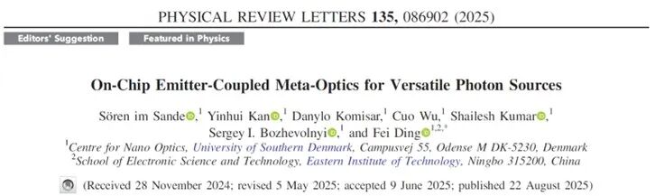 这一重磅成果以“On-Chip Emitter-Coupled Meta-Optics for Versatile Photon Sources”为题,发表在国际物理学顶级期刊《物理评论快报》(Physical Review Letters)上,并因其重要性被选为“编辑推荐”(Editors' Suggestion)在官网亮点展示。同时,美国物理学会旗下权威科学期刊《物理》(Physics)也以“Microchip Provides Made-to-Order Photons”为题,对该研究进行了重点报道。