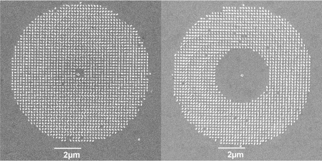 图2.样品扫描电镜图。左图与右图的两组天线阵列,分别产生线偏振光子(左)和圆偏振光子(右),并在特定方向上发射。光子的偏振状态并不是由整体阵列的形状(如圆盘或环形)决定,而是由天线的精确排布方式决定。每个阵列的直径大约为10微米。