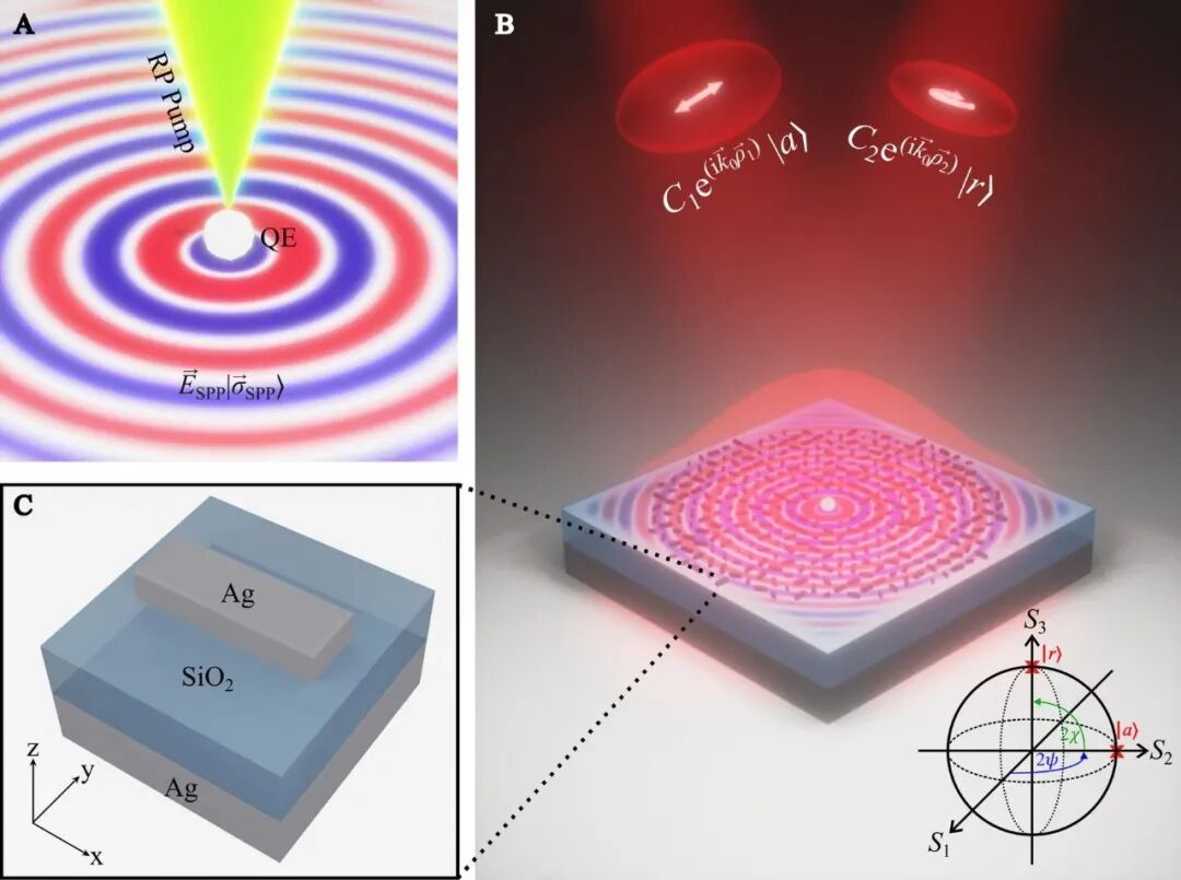 图1.微芯片上实现“定制光子”。激光脉冲(图A)激发纳米钻石中的氮-空位中心产生表面等离激元(图A和B中红色和蓝色圆圈所示)。当这些表面波向外传播时,会遇到一系列“纳米超构原子”,并被重新散射为光子。通过选择天线的尺寸和排布,可以生成具有任意方向或偏振的光子(图C中展示了线偏振和圆偏振)。