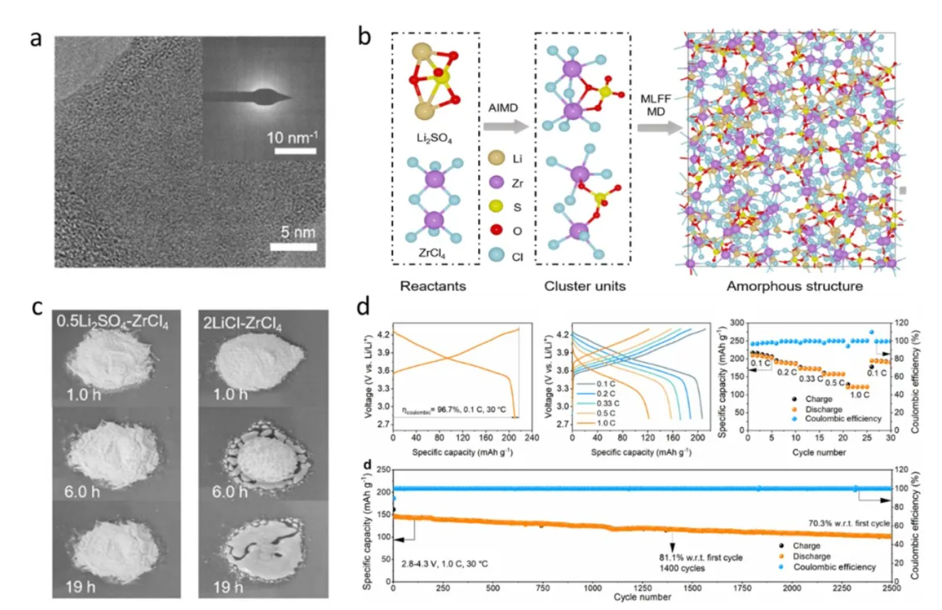 他们通过简单的机械球磨法,成功合成了一类名为xLi2SO4-ZrCl4系列非晶卤化物电解质。所谓非晶,通俗地说,就是材料内部原子排列不像晶体那样规整有序,而正是这种“乱”,带来了意想不到的好处: